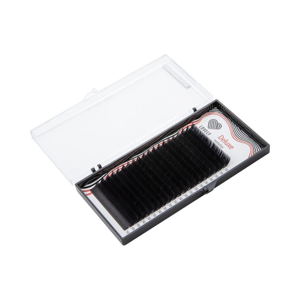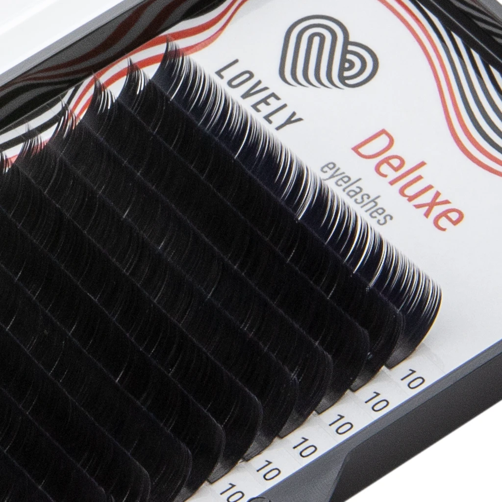 Ресницы Lovely серии «Deluxe» отличаются особой формулой используемого волокна, которая делает ресницы ультрамягкими и очень гибкими. Каждая ресница имеет параметры, максимально схожие с натуральными ресницами — ресница начинает сужаться уже с 2/3 своей длины. Все ресницы серии «Deluxe» хорошо пигментированы от основания до самого кончика, имеют красивый матовый чёрный цвет, не деформируются в процессе работы и превосходно держат форму во время носки.